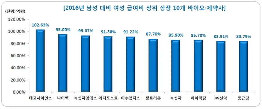 남성 대비 여성의 급여가 가장 높은 회사는 테고사이언스였다. 이 회사의 남성 대비 여성 급여비는 102.6%였는데, 이는 남성보다 여성의 급여가 더 높은 것으로 풀이된다.
