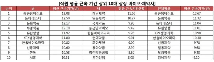 직원 평균 근속 기간이 가장 긴 회사는 종근당바이오로 12.7년에 달했다. 이어 동화약품(11.3년), 동아에스티(11.0년), 유한양행(11.0년), KPX생명과학(11.0년), 한올바이오파마(13.3년), 신풍제약(9.8년), 일동제약(9.7년), 부광약품(9.4년), 경남제약(9.1년) 등이 뒤를 이었다.