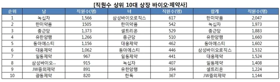상위사 중 여성 직원들의 비중, 급여 등 다양한 면에서 대우가 좋은 회사는 셀트리온, 급여면에서는 셀트리온, 녹십자, 종근당 등이 비교적 여성들이 남성 대비 좋은 대우를 받고 있는 것으로 조사됐다.