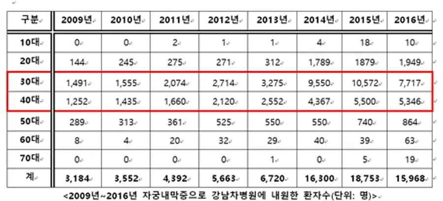 강남차병원 통계에 따르면 자궁내막증 환자가 2009년 3,184명에서 2016년 15,968명으로 최근 8년 사이 5배 가량 증가한 것으로 나타났다. 연령별로는 30대가 60.1%로 가장 많으며, 40대가 36.9%, 20대 10.8%, 50대(6.3%), 60대(0.4%), 10대(0.1%)순으로 나타났다.