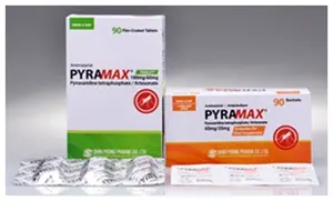 피라맥스는 신풍제약과 말라리아치료제 개발을 지원하는 비영리단체인 스위스의 MMV(Medicines for Malaria Venture)가 공동으로 개발한 차세대 말라리아 치료제로 정제의 경우 2011년 MFDA와 2012년 EMA로부터 신약 승인을 받았고, 소아용 과립은 2015년 EMA와 2016년 MFDS로부터 승인을 받았다. 이후, 2017년 6월 WHO의 ‘필수의약품 모델 리스트’(Model List of Essential Medicines)에 새롭게 등재된 말라리아 치료제 이다.