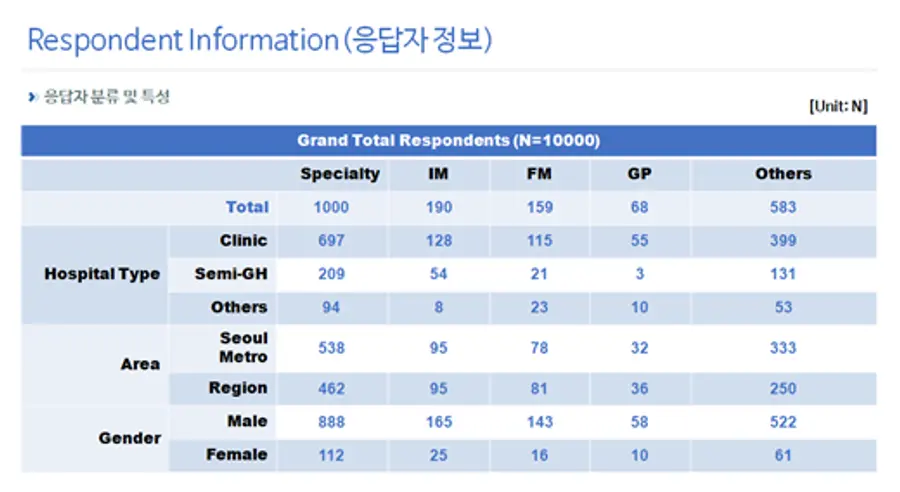 전문과별 응답자 수는 내과 의사가 190명으로 가장 많았고, 가정의학과 159명, 일반의 58명 기타 583명이었다. 근무처 별로는 의원이 70%를 차지했고, 병원 21%, 요양병원 9%이었다.