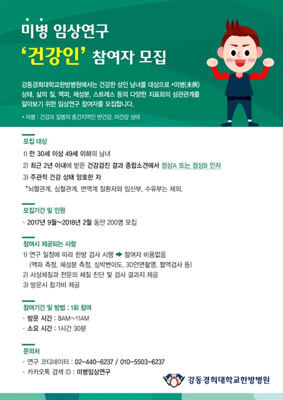 임상연구 문의 : 연구 코디네이터 02-440-6237 (카카오톡ID : 미병임상연구)