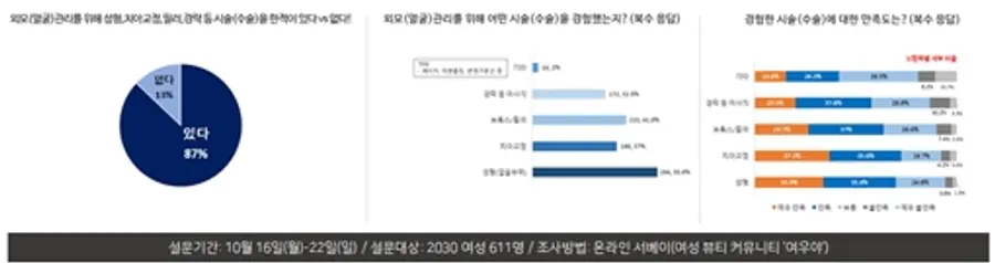 이번 설문의 응답자 중 87%가 외모관리를 위해 성형, 치아교정, 보톡스/필러 등 미용 시술을 경험했다고 응답했으며, 가장 많이 경험한 시술은 성형(55.6%), 보톡스/필러(41.8%), 치아교정(37%), 경락 등 마사지(32.5%) 순으로(복수 응답) 나타났다.