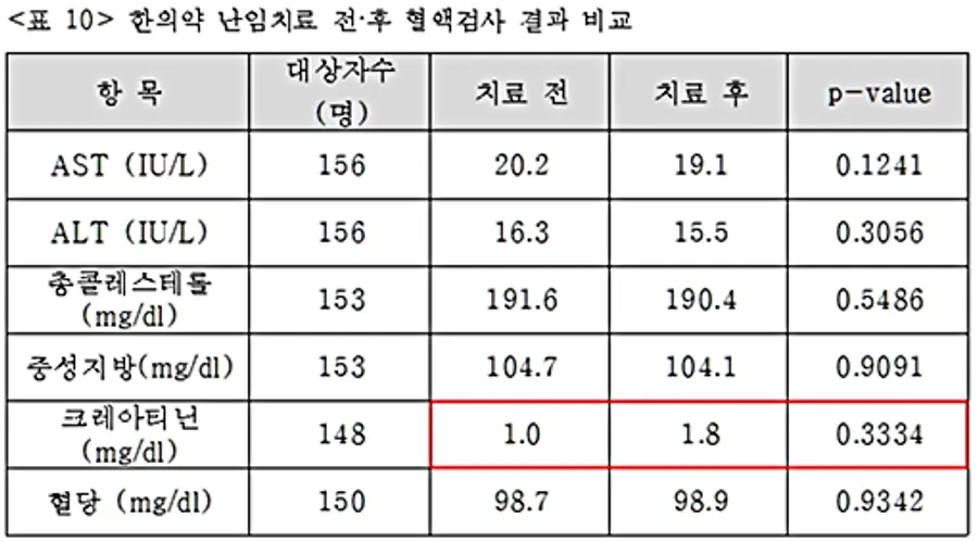 그러나 이 역시 신장독성 문제를 축소시키는 시도로 보인다. 검사실에 따라 혈청 크레아티닌 정상 상한치는 1.1 mg/dl에서 1.3 mg/dl 정도이다. 크레아티닌 정상 상한치가 1.2 mg/dl이라고 할 때, 1.32 mg/dl로 약간 높아져도 신장기능을 제일 정확히 반영하는 사구체여과율(GFR)이 정상의 50~60%로 대폭 감소할 수 있다. 따라서 사후 평균이 1.8 mg/dl로 증가한 것은 일부 대상자에서 난임한약에 의해 신장독성이 발생했음을 강력히 시사한다. 또한 본 연구소는 148명의 대상자에서 사업 전후 크레아티닌의 평균치가 1.8배 증가했음에도 통계적인 유의성이 없다고 한 보고서 내용을 신뢰할 수 없다.