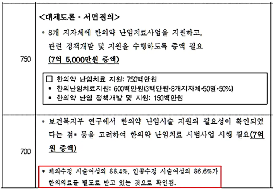 이번 보건복지위원회 예산심사소위원회에서 한의약 난임치료 지원 예산을 신규 편성한 이유 중 하나는 "보건복지부 연구에서 한의약 난임시술 지원의 필요성이 확인되었다는 점"이다. 보건복지부 연구용역사업으로 한국보건사회연구원이 수행한 ‘2014년도 난임부부 지원사업 결과분석 및 평가' 보고서에 "체외수정 시술여성의 88.4%, 인공수정 시술여성의 86.6%가 한의의료를 별도로 받고 있는 것으로 확인됨"이 바로 한의약 난임치료 지원의 근거가 된 것이다. 체외수정이나 인공수정을 받은 난임환자들이 난임 진단 후부터 시술을 받은 이후까지 한방난임치료가 아니라 한방진료를 많이 받았다는 것이 어떻게 지자체 한방난임 시술지원의 근거가 될 수 있단 말인가?