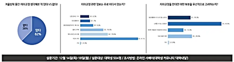 설문을 진행한 얼라인테크놀로지코리아 담당자는 “매년 겨울방학 시즌이면 치아교정을 고려하는 이들이 많다. 특히, 인비절라인과 같은 투명교정이나 설측교정 등 티 나지 않는 교정치료에 대한 문의가 늘고 있다”며, “심미성, 기능성 등을 고려한 교정방법이 다양화되고, 온라인 상에서도 교정 관련 정보를 쉽게 얻을 수 있어 환자의 선택 폭이 넓어졌지만, 무엇보다 전문의와의 정확한 상담을 통해 본인에게 맞는 치료법을 선택하는 것이 중요하다”고 전했다.
