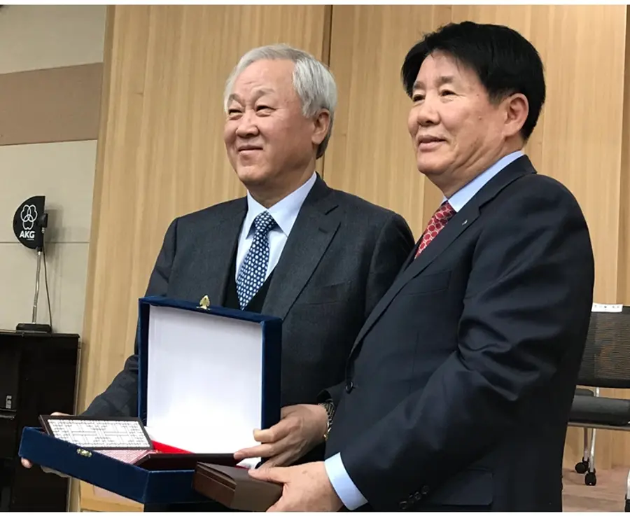 ▲한국제약바이오협회 이정희(오른쪽) 신임 이사장이 전임 이행명(명인제약 대표) 이사장 ㅠ에게 공로패를 전달하고 있다.