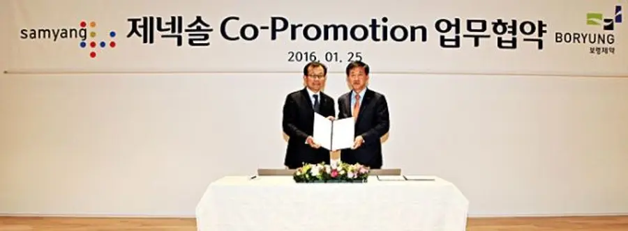 ▲2016년 보령제약은 삼양과 제넥솔을 판매를 대행하는 업무협약을 했다(왼쪽 보령 최태홍 대표와 삼양바이오팜 엄태웅 대표).