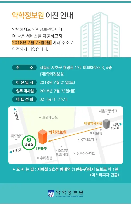 이전한 사무실의 주소는 서울시 서초구 효령로 132 미피하우스 3,4층이다. 의약품식별표시 등록접수처 위치 또한 미피하우스 3층으로 변경됐다.
