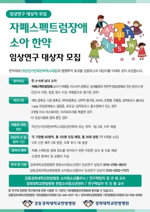 강동경희대학교한방병원 한방소아청소년클리닉 장규태 교수팀은 자폐스펙트럼장애에 한약제제(억간산가진피반하엑스과립)의 효과를 검증하기 위한 소아 대상자를 모집한다.