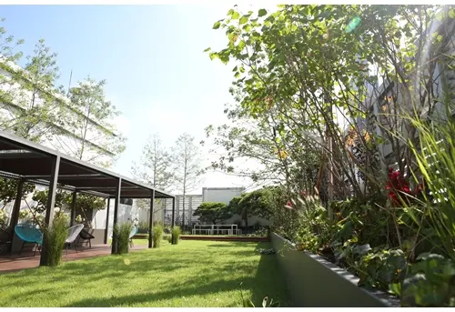 옥상정원에는 소나무와 단풍나무, 포도 덩굴과 백합나무, 불두화와 라일락 등 다양한 종류의 식물로 꾸며졌다. 또 데크와 잔디 등 공간에 따라 다채로운 테이블과 파라솔을 두어 동아제약, 동아에스티 등 동아쏘시오그룹 임직원 누구나 이곳을 찾아 휴식을 취할 수 있도록 했다.