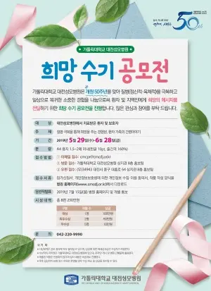 가톨릭대학교 대전성모병원(병원장 김용남 신부) 29일부터 6월 28일까지 ‘개원 50주년 기념 희망 수기 공모전’을 진행한다.