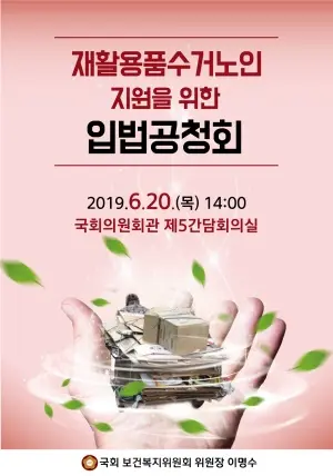 이명수 국회 보건복지위원회 위원장(충남 아산갑)은 보도자료를 통해 “6월 20일(목) 14시에 국회의원회관 제5간담회의실에서 「재활용품수거노인 지원을 위한 입법공청회」를 개최한다”고 밝혔다.