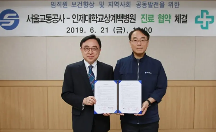인제대학교 상계백병원(조용균 원장)은 지난 21일 서울교통공사와 진료 협약을 체결했다. 이번 협약식은 상계백병원 조용균 원장, 종합건강증진센터소장 김종우 교수, 서울교통공사 최정균 안전본부장, 조진환 보전환경처장 등 관계자 16명이 참석한 가운데 진행됐다.