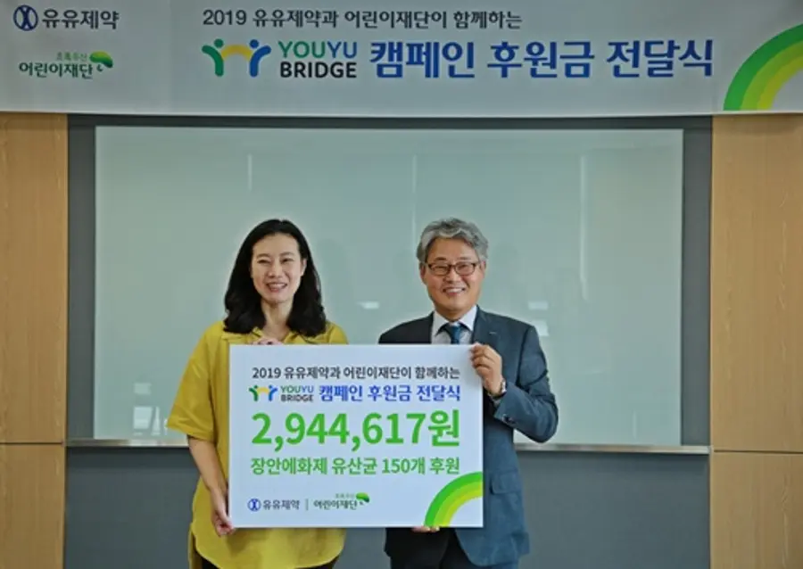 유유제약은 지난 4월 한 달간 진행한 사회공헌 캠페인 ‘Youyu Bridge’ 후원금을 초록우산어린이재단에 전달했다.