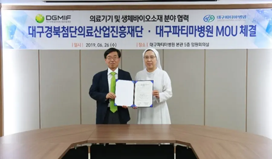 대구파티마병원(원장 박진미)은 대구경북첨단의료산업진흥재단(이사장 이영호)과 26일 대구파티마병원 본관 5층 임원회의실에서 첨단의료산업의 육성을 위한 업무협약을 체결했다.