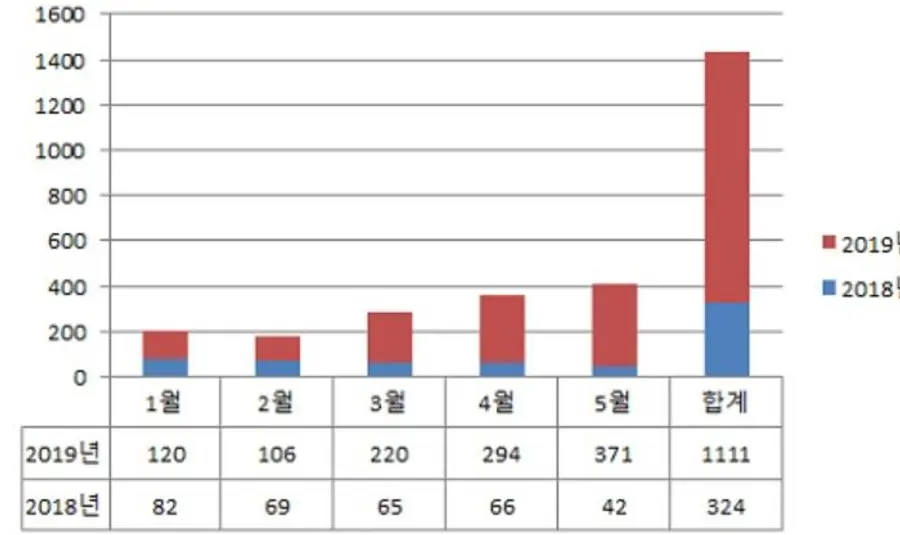 월별로는 1월 120건, 2월 106건에서 2월 금지 발표 직후인 3월에는 220건으로 급증했고, 4월은 294건, 5월에는 371건으로 급증세를 보였다.