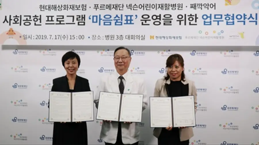 푸르메재단 넥슨어린이재활병원(원장 임윤명, 이하 푸르메어린이재활병원)은 17일 현대해상화재보험(주), 째깍악어(주)와 ‘마음쉼표’ 운영을 위한 업무협약을 체결했다.