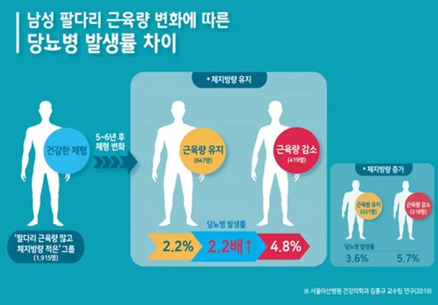 반면, 팔다리 근육량이 줄어든 남성은 유지 그룹보다 2.2배 높은 4.8%의 당뇨병 발생률을 보였다. 체지방량은 거의 변화하지 않은 상태에서 팔다리 근육량이 줄어들자 당뇨병 발병 위험이 높아진 것이다.