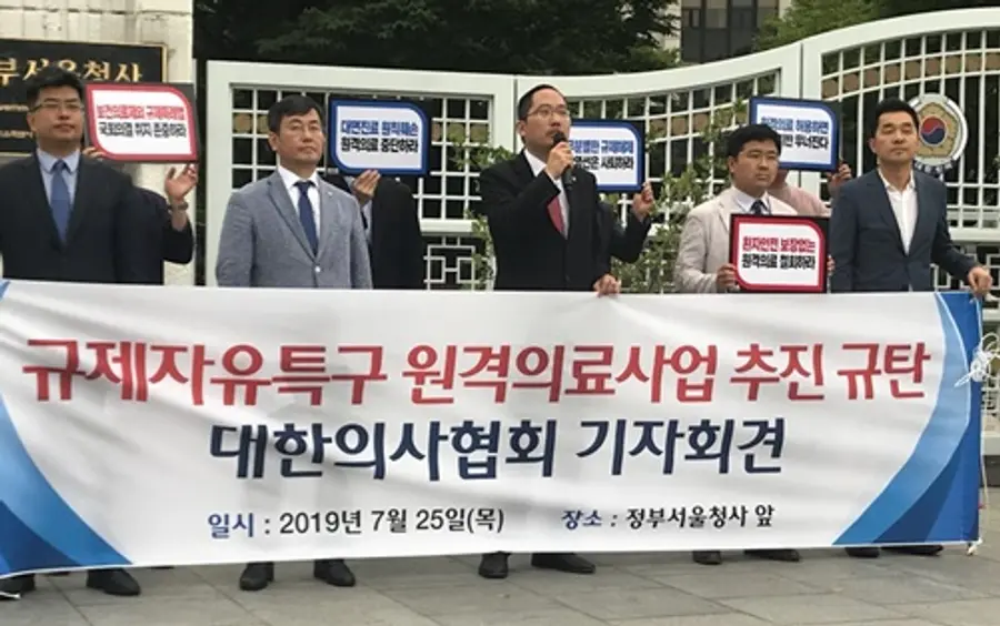 대한의사협회(회장 최대집, 이하 의협)는 25일 오전 11시 정부서울청사 앞에서 '규제자유특구 원격의료사업 추진 규탄' 기자회견을 열고 윈격의료사업을 추진 중인 정부를 비판했다.