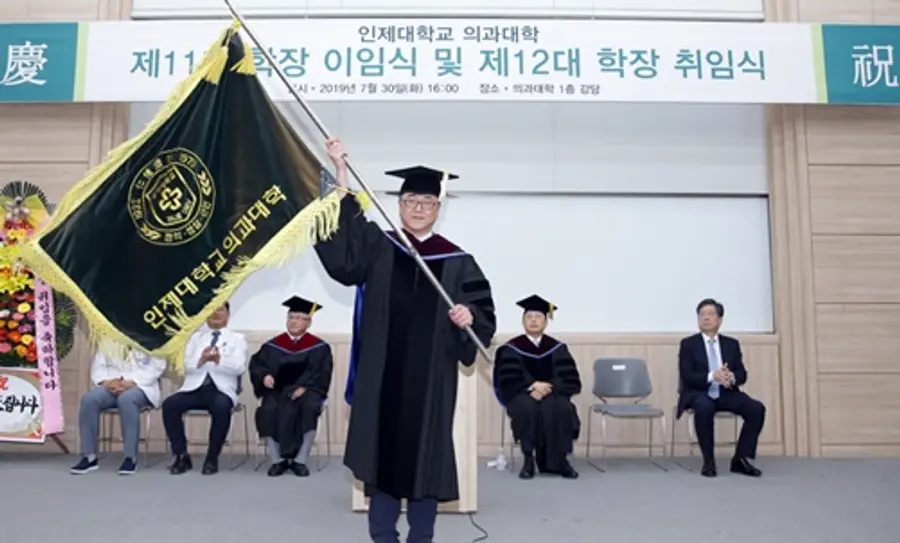 이병두 인제대 의약부총장은 축사와 함께 12대 최석진(사진) 신임 학장에게 임명장을 수여하고, 의과대학 교기를 전달했다.