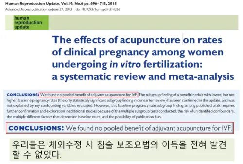 외국에서는 침구치료가 의학적 보조생식술의 임신성공률을 높이는 효과가 있는지 확인하기 위해 대조군을 둔 수많은 RCT를 시행하고 [논문 1], 체계적 문헌고찰 및 메타분석을 통해 결국 침구치료의 유효성이 없음을 입증한 연구들을 수행하고 있다 [논문 2]. 이런 외국의 난임치료 관련 연구현황을 고려하면, 연구자의 해명은 전혀 수긍할 수가 없다. 연구자들이 한방난임치료의 유효성을 입증하려 했다면 [논문 1]에서처럼 무작위 대조 이중맹검 임상시험을 시행했어야 한다. 하지만 한방난임치료의 임신율(14.4%)이 너무나도 낮아 RCT를 해도 유효성이 있다고 나올 가능성은 거의 없다고 본다.