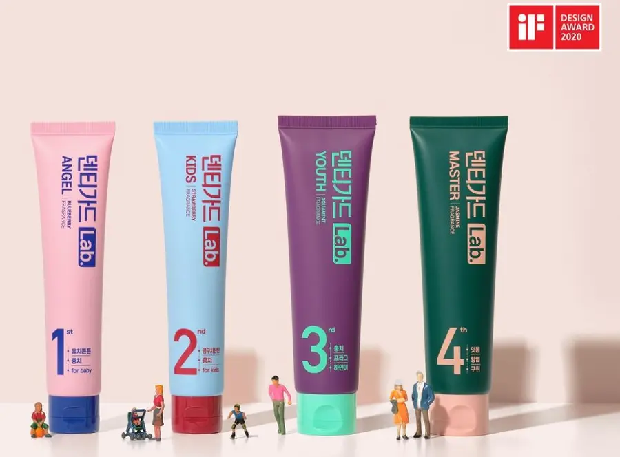 ‘덴티가드랩’은 영유아기부터 중·장년기까지 총 4단계로 구성된 치약으로, 단계별 기능을 직관적으로 표현해 사용자가 본인에게 맞는 단계의 제품을 선택할 수 있도록 디자인되었다. 또한, 과감한 배색을 사용하고, 그래픽 효과를 배제한 심플한 디자인으로 ‘덴티가드랩’만의 단계별 특징을 부각시켰다.