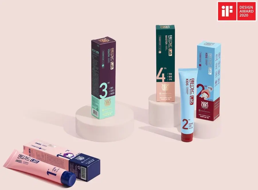 ▲대웅제약이 세계 3대 디자인상 중의 하나인 ‘iF 디자인 어워드’에서 본상을 수상한 구강생애주기별 맞춤치약 ‘덴티가드랩’ 제품사진.