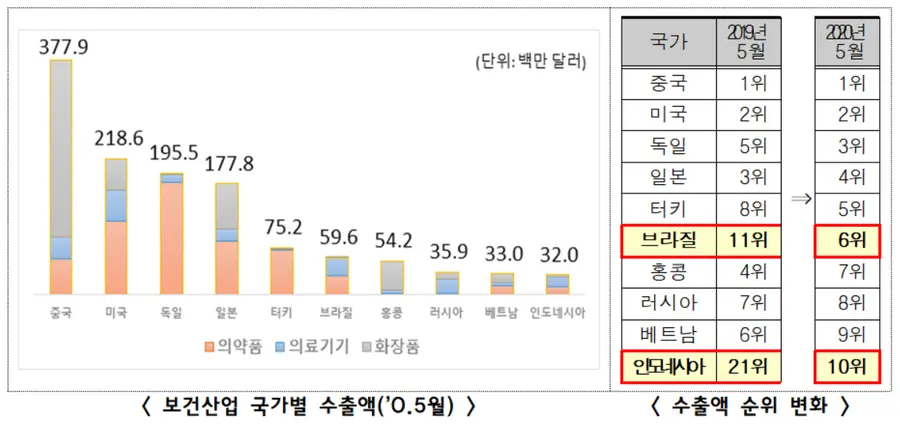 국가별로는 브라질(0.6억 달러, +157.7%)의 의료기기(진단키트) 수출이 크게 증가함에 따라 10위권 안으로 진입, 미국, 독일, 일본, 터키 등 의약품 수출 상위권 국가로의 수출확대가 지속되었으며, 상위국 중 화장품 수출은 일본으로 확대되고 있는 것으로 나타났다.