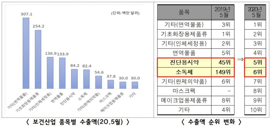 보건산업 누적 수출액(20.1~5월)은  78.3억 달러로 전년 동기대비 24.0% 증가하였으며, 산업별로는 의약품(30.9억 달러, +49.0%), 화장품(28.9억 달러, +8.1%), 의료기기(18.5억 달러, +18.2%) 순을 기록했다.