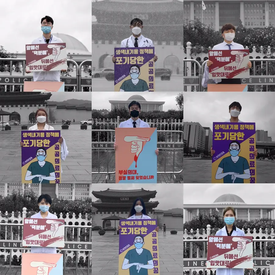 ▲ 의대협이 정부의 의대 정원 확대 추진을 비판하는 릴레이 1인 시위를 진행했다. 왼쪽 위부터 순서대로 백명훈 기획이사, 김재의 부회장,  정호민 홍보이사, 고우림 부회장, 김기덕 부회장, 신주윤 총무이사, 김은영 보건의료이사, 김보현 국제이사, 강주연 국제이사