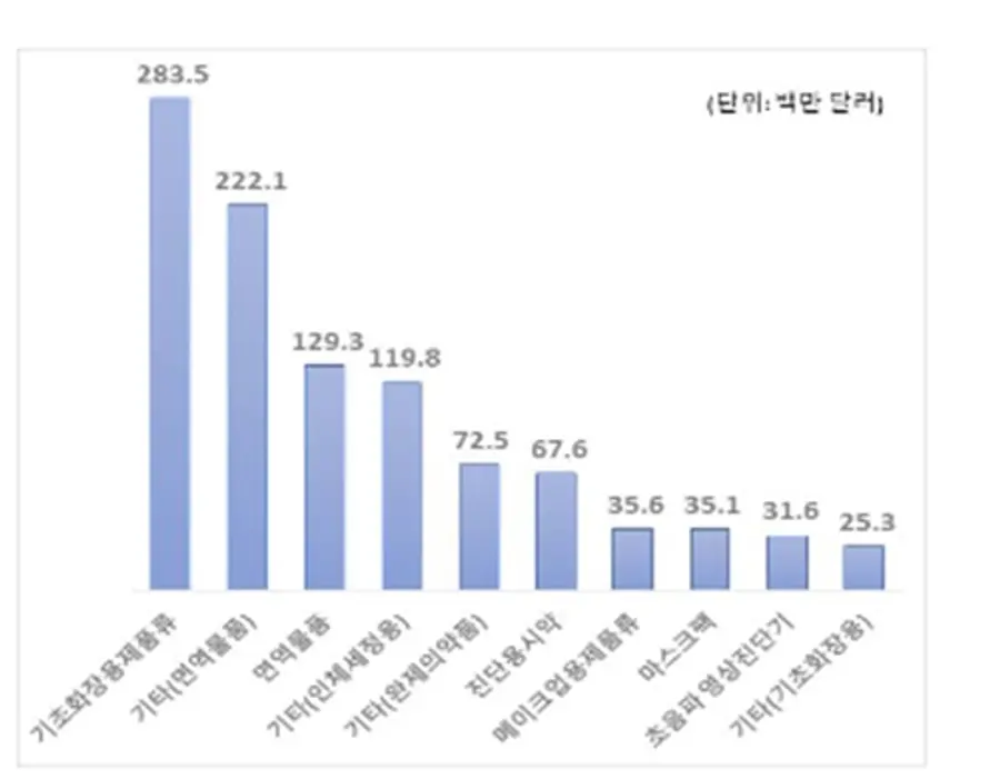 품목별 수출순위는 ‘기초화장품제품류’(2.8억 달러, +26.9%), ‘기타 면역물품’(2.2억 달러, +186.5%), ‘면역물품’(1.3억 달러, +106.3%) 등 순으로 나타났다.