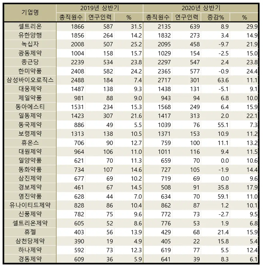 이 밖에 보령제약, 삼천당, 휴온스, 경보제약, 휴젤 등도 지난해보다 연구인력을 10% 정도 늘렸다.