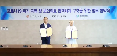 대구파티마병원(병원장 김선미)은 9월 15일 한국감정원(원장 김학규)과 코로나19 위기 극복 및 보건의료 협력체계 구축을 위한 업무협약을 체결하였다.