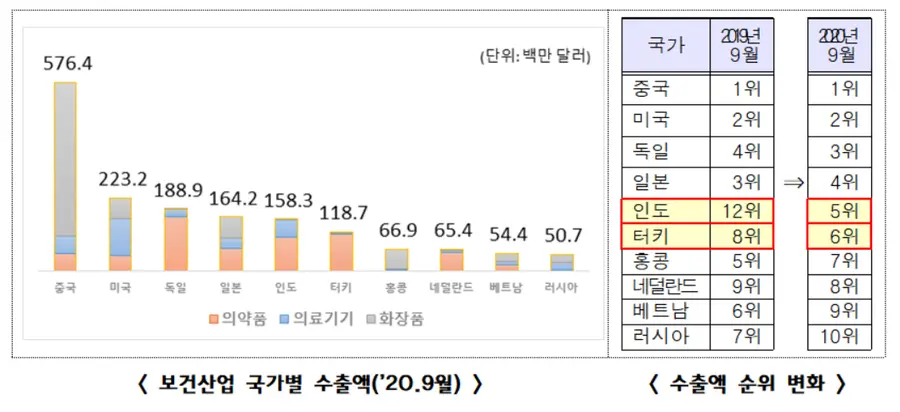 보건산업 수출 1위국인 중국(5.8억 달러, 47.8%)은 저조했던 화장품 수출이 회복세를 보이고 있으며, 인도(12→5위, 1.6억 달러, +631.4%), 터키(8→6위, 1.2억 달러, +248.3%) 등 의약품 수출이 크게 증가함에 따라 순위가 상승했다.