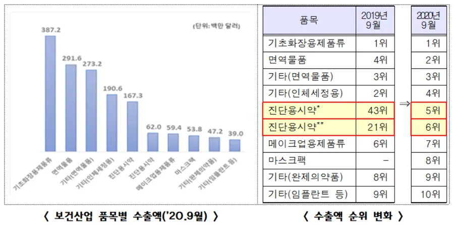 진흥원에 따르면 2020년 9월 보건산업 수출 수출액은 총 23억 달러로 전년 동월 대비 69.2% 증가했다. 산업별로는 의약품 8.4억 달러(+84.8%), 화장품 8.4억 달러(+48.8%), 의료기기 6.2억 달러(+82.6%) 순으로 수출액이 많았다.