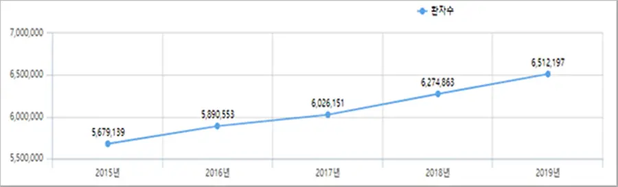 건강보험심사평가원의 자료에 의하면 최근 5년간(2015~2019년) 고혈압 환자수는 2015년 567만 9,139명에서 2019년 651만 2,197명으로 꾸준히 증가(약 14.6%)한 것으로 나타났다.