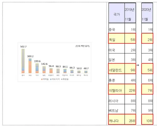 수출 상위 10개국 중 독일(3.0억 달러, +336.3%), 네덜란드(1.0억 달러, +153.8%), 이탈리아(0.8억 달러, +535.0%), 캐나다(0.5억 달러, +463.5%)는 바이오의약품 및 진단용시약 수출이 크게 증가함에 따라 순위가 대폭 상승하였다.