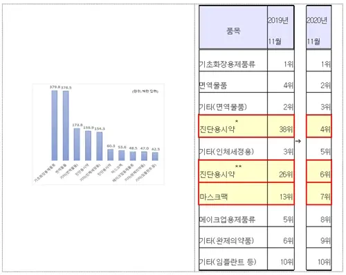 〈 보건산업 품목별 수출액(’20.11월) 〉         〈 수출액 순위 변화 〉