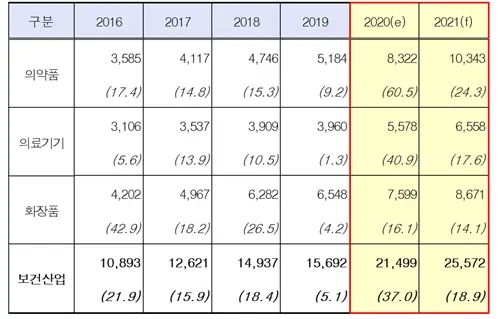 또한 “2021년 역시 진단제품 수출 유지, 바이오시밀러 해외 판매 가속화 및 백신 등 의약품 위탁생산(CMO) 수주 확대 등의 긍정적 요인으로 수출액 256억 달러 수준을 전망”, “주력산업인 철강*(267억 달러) 및 석유제품*(285억 달러) 등과 어깨를 견주며 新성장 수출 동력산업으로 역할을 이어나갈 것이다”고 내다봤다.