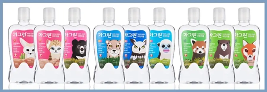 사과맛, 딸기맛, 풍선껌맛 3가지 종류로 구성되어 있다. 어린이용 가그린은 충치예방과 입냄새 제거에 효과가 있으며, 타르색소와 알코올을 함유하지 않은 것이 특징이다.