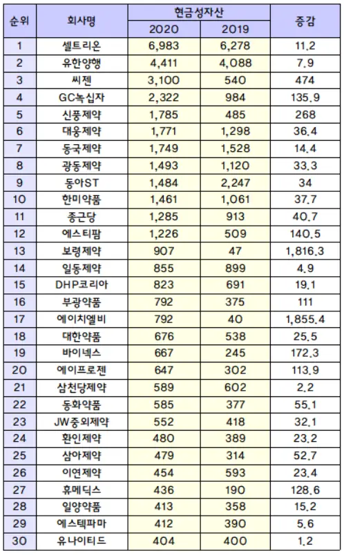 또 2위는 유한양행으로 4411억원(7.9%증가), 3위 3100억원(474%), 4위는 GC녹십자로 2322억원(135%)으로 이들 4개사가 현금성자산이 2천억원을 넘었다.