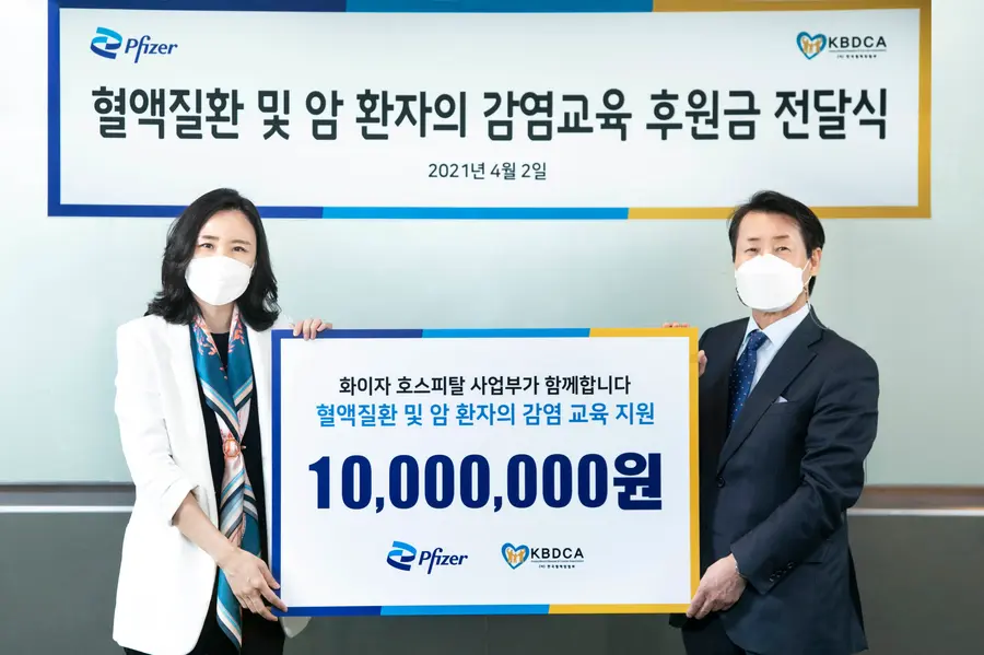 한국화이자제약(대표이사 사장 오동욱)이 (사)한국혈액암협회에 혈액질환 및 암 환자의 감염 교육 지원을 위한 후원금 1000만원을 전달했다고 12일 밝혔다.