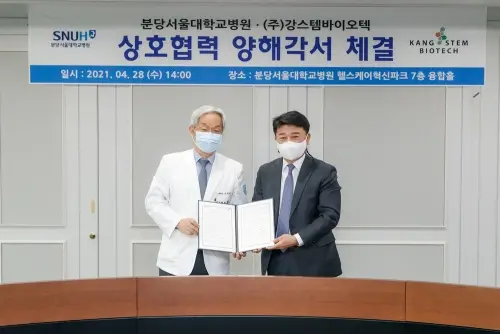 분당서울대학교병원(의생명연구원장 오창완)는 지난 4월 28일 강스템바이오텍(대표이사 나종천)과 ‘첨단재생의료 및 첨단재생의약품 연구개〮발’ 협력을 위한 양해각서(MOU)를 체결했다.