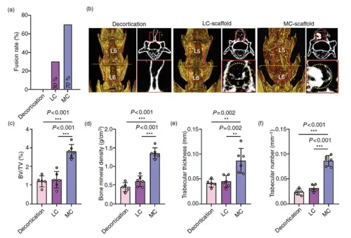 연근 모양의 작은 채널들로 구성된 콜라겐과 하이드록시아파타이트가 혼합된 지지체를 척추유합 동물모델에 이식한 결과 연근 모양의 작은 채널이 없는 지지체에 비해 골형성이 약 4배 증가됐다