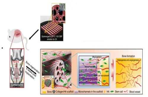 척추유합 동물 모델에서 4D 프린팅 기술을 이용하여 제작된 연근 모양의 작은 채널들로 구성된 콜라겐과 하이드록시아파타이트가 혼합된 지지체를 이식하는 경우 혈관형성 유도와 골재생 유도가 증가하여 골형성이 증가됨 확인했다.