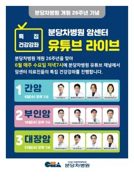 분당차병원은 이번 유튜브 라이브를 통해 ‘간암, 난소암, 대장암’에 대한 질환정보를 제공하고, 국내 최고 암 명의 군단 의료진이 출연해 간암, 난소암, 대장암의 원인부터 증상, 검사, 수술, 항암 치료까지 환자들의 다양한 궁금증에 답한다. 라이브 댓글 참가자에게는 추첨을 통해 사은품을 준다.