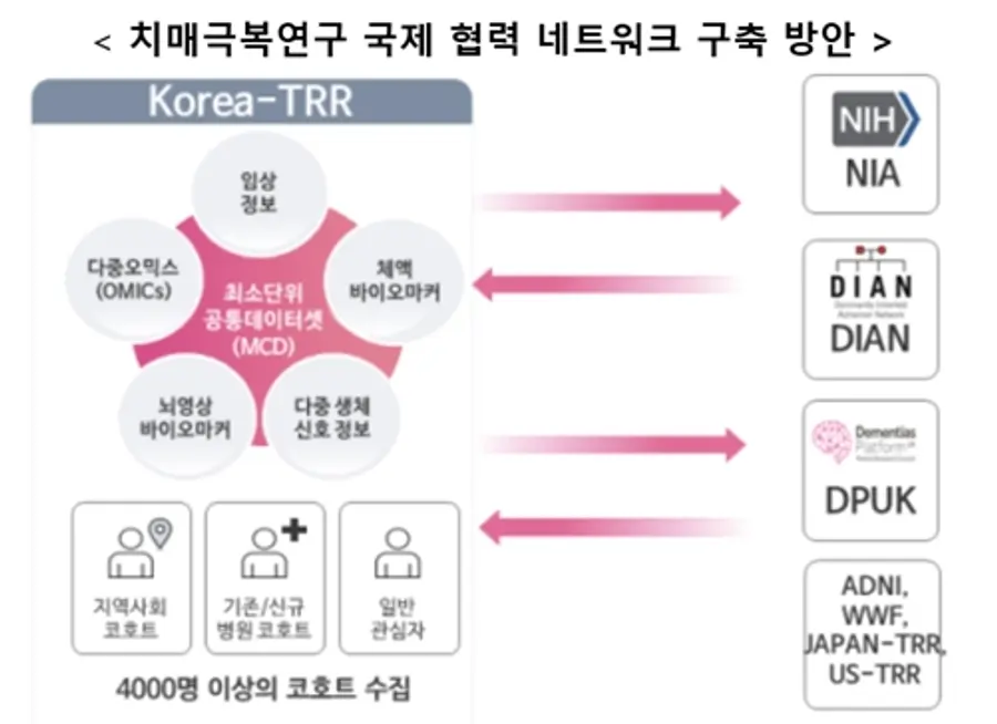 뿐만 아니라, 미국의 주도로 14개 글로벌 연구기관이 참여하는 우성유전 알츠하이머 네트워크(Dominantly Inherited AD Network, DIAN)에도 참여키로 하였으며 영국의 치매연구정보통합시스템(Dementias Platform UK, DPUK)과도 상호 데이터 교류를 위한 업무협약을 맺고 긴밀하게 협력할 계획이다.