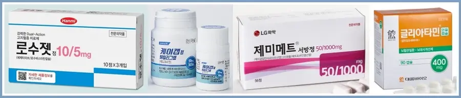 ▲ 왼쪽부터 한미 '로수젯, inno.N '케이캡', LG화학 '제미메트', 대웅 '글리아타민'